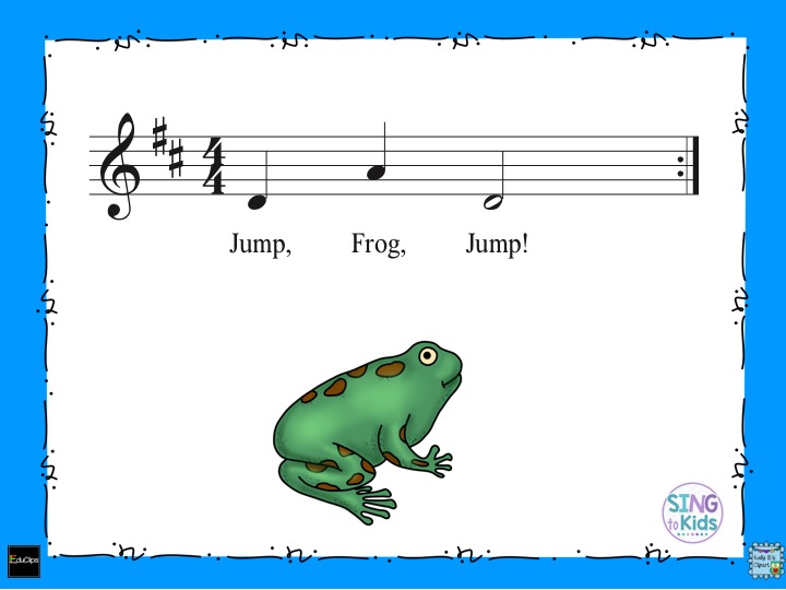 This is such a lovely, sequential story with a repetitive line – “jump, frog, jump!” I begin by simply reading the story to my students. Each time “jump, frog, jump” occurs, we sing it using a “do-sol-do” response. The second class, I read the story again and we identify the solfege of the response. I also introduce the Orff instruments that we’re going to use to transfer our singing part to instruments. It’s not the first time on the instruments, so a quick review of how to hold mallets and play the instruments is all that is required. The third class, the students come to a xylophone with a partner. One partner plays while another observes. We transfer the “jump, frog, jump” to the bars D and A. The students practice playing the “do-sol-do” pattern on the bars several times. Then I retell the story with the students playing the response instead of singing it. At the end of the story, the person playing teaches the partner every thing they need to know to play, and we retell the story with the second partner.