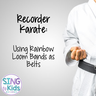 Music teachers, if you’re like me – you have to teach recorders at some point in your curriculum. It takes a lot of time and patience, but it can be a wonderful learning experience for students. As many of us, I use Music K-8‘s Recorder Karate framework for music learning. The premise behind the book is that as students master skills, they earn belts for their recorder. Great, right? Yeah, until you have to put a belt on that recorder! For years, I used ribbon carefully cut in 6 inch strips in all nine colors. The students would tie their belt on the recorder and hope and pray it didn’t fall off! This year, I had an epiphany! You know those ever-so-popular Rainbow Looms? You know them – look at every second grader in your school (those rubber band bracelets and necklaces). Why not use the bands from the Rainbow Loom for Recorder Karate belts? Love it! I purchased each color (still searching for brown – they make it but my craft store didn’t have it in stock) as well as a little case to keep them organized.